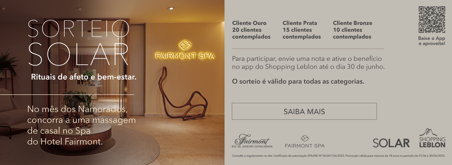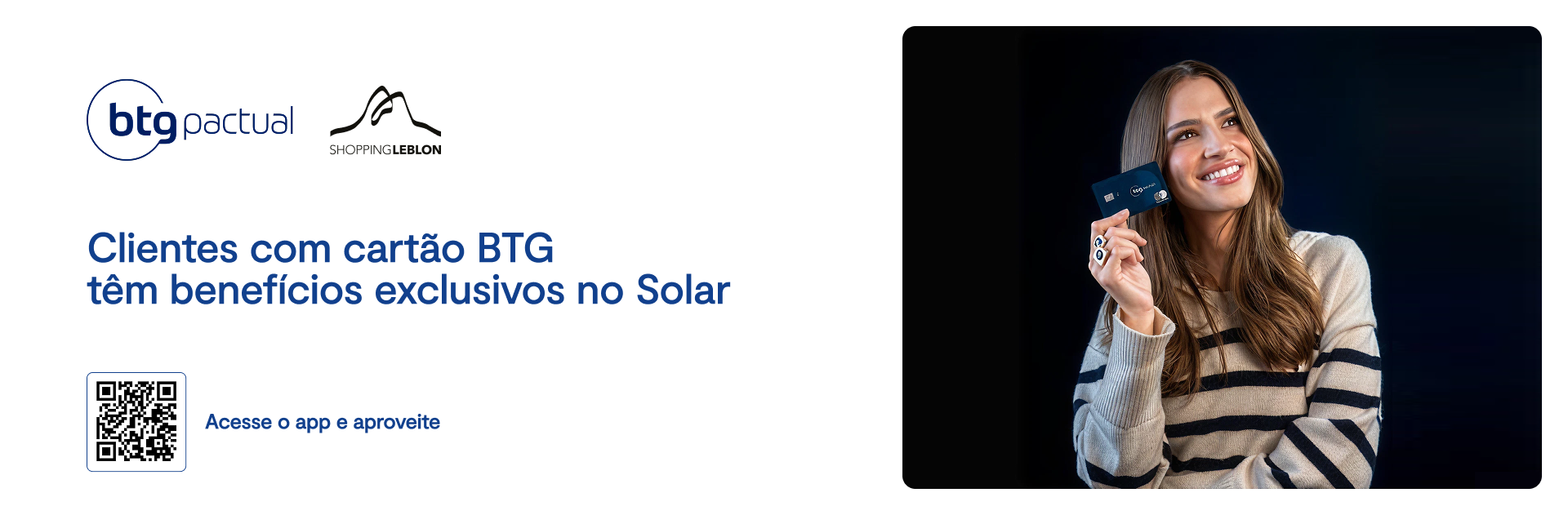 O Solar Shopping Leblon é um programa de pontuação prático, ágil e transparente. A cada nota fiscal enviada no App, o cliente acumula saldo e pode usufruir diversos benefícios exclusivos como descontos, serviços, brindes e experiências customizadas. O Lounge Solar está localizado no 1º piso, próximo ao Atendimento ao Cliente.